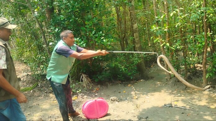 সুন্দরবনের করমজলে অবমুক্ত করা হয়েছে একটি বিষধর খৈয়ে কোবরা সাপ। বৃহস্পতিবার দুপুরে এই সাপটি পূর্ব সুন্দরবন বিভাগের চাঁদপাই রেঞ্জের করমজল বন্যপ্রাণী প্রজনন কেন্দ্র সংলগ্ন বনে অবমুক্ত করা হয়। এর আগে বিষধর এ সাপটি বনবিভাগের বন্যপ্রাণী ব্যবস্থাপনা ও প্রকৃতি সংরক্ষণ বিভাগের ষ্টাফেরা সকালে খুলনার বটিয়াঘাটা থেকে উদ্ধার করেন। মাছের ঘেরে পানি সরানোর সময় জালে আটকা পড়ে সাপটি।