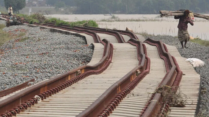 টানা বৃষ্টিতে বান্দরবান থেকে নেমে আসা পাহাড়ী ঢলে নির্মাণাধীন দোহাজারি-কক্সবাজার ১০০কিমি রেললাইন প্রকল্পের সাতকানিয়া এলাকায় রেললাইনের নীচ থেকে মাটি, পাথর সরে গিয়ে প্রায় ২ কি.মি রেলপথ ক্ষতিগ্রস্ত হয়েছে। শুক্রবার (১৮আগস্ট) সকালে রেল সচিব হুমায়ুন কবীর প্রকল্পের ক্ষতিগ্রস্ত এলাকা পরিদর্শন করেন।