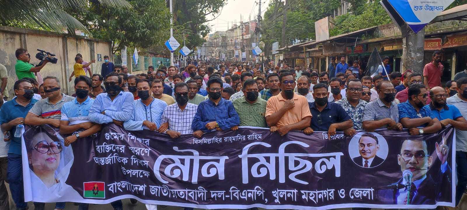 গুম হওয়া পরিবারের কান্না দেখলে মানুষের হৃদয়ে রক্তক্ষরণ হয় কিন্তু ফ্যাসিস্ট সরকারের কিছুই আসে যায় না। জনগণের ভোটে নির্বাচিত নয় বলেই খুন ও গুম করতে তাদের বুক কাঁপে না উল্লেখ করে খুলনা মহানগর ও জেলা বিএনপির নেতৃবৃন্দ বলেছেন, জবাবদিহিতা থাকলে সরকার এধরণের ঘৃণিত অপরাধ করার সাহস পেতো না। বুধবার (৩০ আগস্ট) গুমের শিকার ব্যক্তিদের স্মরণে আন্তর্জাতিক দিবস উপলক্ষে খুলনা মহানগর ও জেলা বিএনপির উদ্যোগে মুখে কালো কাপড় বেধে মৌন মিছিল পুর্ব সংক্ষিপ্ত সমাবেশে সভাপতির বক্তব্যে তারা এসব কথা বলেন। সরকারের রোষানলে পড়ে যারাই খুন হয়েছেন, গুম হয়েছেন তারা সকলেই গণতন্ত্রের সৈনিক। তাদের অপরাধ ছিলো তারা স্বৈরতন্ত্রের বিরুদ্ধে প্রতিবাদী হয়ে রাজপথে নেমেছিলেন। গুম-খুন করে জোর-জবরানে চিরদিন ক্ষমতায় থাকা যায় না। চলমান একদফা আন্দোলনেই বিশ্ববেহায়া সরকারের পতন হবে। গুম ও বিচার বহিভূর্ত হত্যার মত মানবতা বিরোধী হিংস্রতা স্বৈরচারী সরকারের গড়ে তোলা আইন প্রয়োগকারী সংস্থার নিত্যকার ঘটনা হয়ে দাঁড়িয়েছে। মহানগর বিএনপির আহবায়ক এড. শফিকুল আলম মনার সভাপতিত্বে অনুষ্ঠিত সমাবেশে বক্তারা আরো বলেন, বর্তমান আওয়ামী ফ্যাসিস্ট সরকার ২০১৪ সালে বিনাভোটে ক্ষমতায় বসেছে। ২০১৮ সালে দিনের ভোট রাতে করে রাষ্ট্রীয় ক্ষমতা দখল করে রেখেছে। বর্তমানে জনবিচ্ছিন্ন হয়ে সরকার জনগণের দাবী উপেক্ষা করে বিভিন্ন দেশে ঘুরে বেড়াচ্ছে। দেশের মানুষ এখন দেশনায়ক তারেক রহমানের নেতৃত্বে ঐক্যবদ্ধ। অবৈধ সরকারকে ক্ষমতা থেকে বিদায় করে জনগণের সরকার প্রতিষ্ঠা করেই জনগণ ঘরে ফিরবে। আন্দোলনের জয় সুনিশ্চিত- খালেদা জিয়া মুক্ত হবেন, তারেক রহমান দেশে ফিরে আসবেন, দেশে তত্ত্বাবধায়ক সরকার প্রতিষ্ঠিত হবে তারপর নির্বাচন হবে। সকল গুম খুনের বিচার এদেশের মাটিতে হবে। মহানগর বিএনপির সদস্য সচিব শফিকুল আলম তুহিন ও জেলা সদস্য সচিব মনিরুল হাসান বাপ্পির পরিচালনায় সমাবেশে বক্তব্য রাখেন ও উপস্থিত ছিলেন জেলা বিএনপির আহবায়ক আমীর এজাজ খান, তারিকুল ইসলাম জহীর, আবু হোসেন বাবু, স ম আ রহমান, মাহমুদ আলী, শের আলম সাল্টু, আবুল কালাম জিয়া, বদরুল আনাম খান, মাহাবুব হাসান পিয়ারু, চৌধুরী শফিকুল ইসলাম হোসেন, আশরাফুল আলম খান নান্নু, শামীম কবীর, একরামুল হক হেলাল, মাসুদ পারভেজ বাবু, শেখ সাদি, হাসানুর রশিদ চৌধুরী মিরাজ, শেখ জাহিদুল ইসলাম, কে এম হুমায়ন কবীর (ভিপি হুমায়ুন). হাফিজুর রহমান মনি, আবু মোঃ মুরশিদ কামাল, কাজী মিজানুর রহমান, মোল্লা ফরিদ আহমেদ, সৈয়দ সাজ্জাদ আহসান পরাগ, শেখ ইমাম হোসেন, হাবিবুর রহমান বিশ্বাস, আবু সাইদ হাওলাদার আব্বাস, মোল্লা সাইফুর রহমান, এনামুল হক, আব্দুল মান্নান খান, বিকাশ মিত্র, আ. রাজ্জাক, গাজী আবদুল হক, 