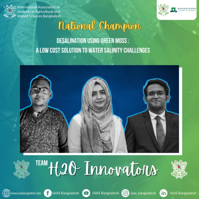 বাংলাদেশের দক্ষিণ-পশ্চিমাঞ্চলের মানুষের লবণাক্ত পানির সমস্যাকে সামনে রেখে খুলনা বিশ্ববিদ্যালয়ের টিম “ H2O Innovators” একটি প্রকৃতি নির্ভর সমাধান উপস্থাপন করে যা খুবই অল্প খরচে এবং সহজভাবে প্রান্তিক মানুষের কাছে বিশুদ্ধ পানি পৌঁছে দিতে সক্ষম হবে। দলটি আগামী ১১ জুন নেদারল্যান্ডসে হতে যাওয়া এই গ্লোবাল ফাইনালে তাদের এই ইনোভেটিভ সলিউশনের মাধ্যমে খুলনা বিশ্ববিদ্যালয় এবং বাংলাদেশকে প্রতিনিধিত্ব করবে।