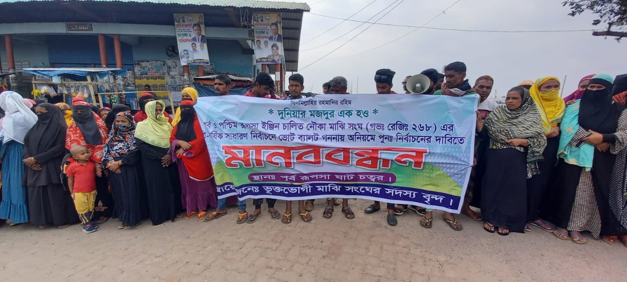 পূর্ব ও পশ্চিম রূপসা ইঞ্জিন চালিত নৌকা মাঝি সংঘের ত্রি-বার্ষিক সাধারণ নির্বাচনে ভোট গননায় অনিয়মে পুননির্বাচনের দাবিতে মানববন্ধন কর্মসূচি ২৫ ফেব্রুয়ারী রবিবার সকাল ১১ টায় পূর্ব রূপসা ঘাট এলাকায় অনুষ্ঠিত হয়। ভুক্তভোগী মাঝি সংঘ আয়োজিত এ মানববন্ধনে মাঝি সমিতির নেতৃবৃন্দরা গত ১৭ ফেব্রুয়ারি ভোট গননার অনিয়মের চিত্র তুলে ধরে বক্তৃতা করেন। মানববন্ধনে ফয়সাল মাহমুদের সভাপতিত্বে বক্তৃতা করেন নাজমুল হোসেন,নুর ইসলাম,তৌহিদ ব্যাপারী,মোফা ব্যাপারী, উতার উদ্দিন,শাহিনুর আক্তার টুনটুনি,হান্নান হাওলাদার, আয়ূব আলী ফকির,শামীম ব্যাপারী,জামাল ব্যাপারি, রোকন হাওলাদার,শফিক ব্যাপারী,মনির ব্যাপারী,আলমগীর হোসেন প্রমূখ।