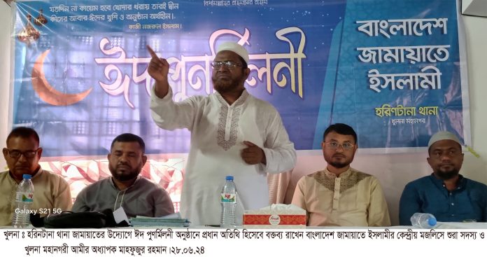 ঈদ-উল-আযহার শিক্ষাকে কাজে লাগিয়ে এদেশে দ্বীন ইসলামকে বিজয়ী আদর্শ হিসেবে প্রতিষ্ঠিত করতে হবে বলে উল্লেখ করে বাংলাদেশ জামায়াতে ইসলামীর কেন্দ্রীয় মজলিসে শূরা সদস্য ও খুলনা মহানগরী আমীর অধ্যাপক মাহফুজুর রহমান বলেন, মনের পশুত্বকে কুরবানি করাই মূলত ঈদ-উল-আযহার প্রকৃত শিক্ষা। ইবরাহীম (আ.)-এর মাধ্যমে সংঘটিত কুরবানির ধারাবাহিকতায় আমরা যেন আমাদের মুসলিম উম্মাহর সঠিক পরিচয়কে চিনতে সক্ষম হই। বাংলাদেশ আজ কঠিন সময় অতিক্রম করছে। বিশেষ করে রাজনৈতিক প্রতিহিংসা, মানবিক অস্থিরতা ও পাশবিকতা আজ গোটা সমাজ ব্যবস্থাকে বিষিয়ে তুলেছে। তিনি বলেন, আমাদের শহীদেরা আমাদের সম্পদ। তারা আমাদের জন্য রেখে গেছেন দ্বিধাহীন সোজা পথ, আমরা উজ্জীবিত হয়েছি তাদের কর্মে ও প্রেরণায়। আজকে আমরা শপথ গ্রহণ করতে চাই, কুরআনের যে সমাজ প্রতিষ্ঠার আন্দোলন বাংলাদেশ জামায়াতে ইসলামী করে যাচ্ছে তাকে বিজয়ের শেষ প্রান্তে না পৌঁছানো পর্যন্ত আমাদের পথচলা অব্যাহত থাকবে। জুময়াবার (২৮ জুন) সকালে হরিণটানা থানা জামায়াতে ইসলামীর উদ্যোগে ঈদপুর্ণমিলনী অনুষ্ঠানে প্রধান অতিথির বক্তব্যে এ সব কথা বলেন।