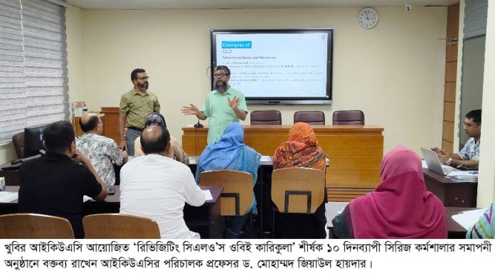 খুলনা বিশ্ববিদ্যালয়ের ইন্সটিটিউশনাল কোয়ালিটি অ্যাসুরেন্স সেল (আইকিউএসি)-এর উদ্যোগে দুটি ফেজে ‘রিভিজিটিং সিএলও’স ওবিই কারিকুলা’ শীর্ষক ১০ দিনব্যাপী একটি সিরিজ কর্মশালা গত ২ জুন শুরু হয়। সৈয়দ নজরুল ইসলাম প্রশাসনিক ভবনের আইকিউএসি’র প্রশিক্ষণ কক্ষে অনুষ্ঠিত এ কর্মশালার প্রথম ফেজে ঈদের ছুটির আগে ২ থেকে ৬ জুন পাঁচদিন ও ছুটি শেষে ২৩ থেকে ২৭ জুন দ্বিতীয় ফেজের পাঁচদিন প্রশিক্ষণ সম্পন্ন হওয়ার মধ্য দিয়ে, আজ শেষ হলো ১০ দিনের সিরিজ কর্মশালা।