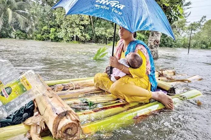 পানিতে ভাসছে জনপদ। দিশাহারা মানুষ। নিহত অন্তত ১৫ জন। দুর্গত মানুষকে নিরাপদে ফিরিয়ে আনতে ও ত্রাণ সরবরাহে কাজ করছে সেনা, নৌ, বিমান বাহিনী, কোস্ট গার্ড, ফায়ার সার্ভিস, পুলিশসহ বিভিন্ন সংস্থা। এ ছাড়াও রেড ক্রিসেন্ট, বৈষম্যবিরোধী ছাত্র আন্দোলনসহ শত শত স্বেচ্ছাসেবী স্পিডবোট ও নৌকা নিয়ে ছুটে চলছেন দুর্গত মানুষকে উদ্ধার ও ত্রাণ বিতরণে। ভারতের ত্রিপুরার উজান থেকে নেমে আসা পাহাড়ি ঢল ও ভারী বৃষ্টিতে স্মরণকালের ভয়াবহ বন্যার মুখোমুখি ফেনীসহ ১১ জেলা। গতকাল বৃষ্টি বন্ধ থাকায় বিভিন্ন এলাকা থেকে নামতে শুরু করেছে পানি। ডুবে গেছে ফেনীর সব কটি উপজেলা। পরশুরাম, ফুলগাজী, ছাগলনাইয়ার পর সদর, দাগনভূঞা ও সোনাগাজীর অবস্থাও ক্রমেই খারাপের দিকে যাচ্ছে। অন্যদিকে কুমিল্লায় গোমতি নদীর বাঁধ ভেঙে তলিয়ে গেছে জেলার বুড়িচং উপজেলা। আগ থেকেই বন্যার পানিতে নিমজ্জিত ছিল কুমিল্লার কয়েকটি উপজেলা। এ ছাড়াও নোয়াখালী, খাগড়াছড়ি, চট্টগ্রাম, কক্সবাজার, লক্ষ্মীপুর, ব্রাহ্মণবাড়িয়া, হবিগঞ্জ, মৌলভীবাজার, সিলেটসহ দেশের বিভিন্ন এলাকা প্লাবিত। পানিবন্দি অন্তত অর্ধকোটিরও বেশি মানুষ। তলিয়ে গেছে ঘরবাড়ি, দোকানপাট, ফসলি ভূমি, মাছের ঘের। ব্যাপক ক্ষয়ক্ষতির শিকার এসব মানুষ। গতকাল সচিবালয়ে এক সংবাদ সম্মেলনে দুর্যোগ ব্যবস্থাপনা ও ত্রাণ মন্ত্রণালয়ের সচিব মো. কামরুল হাসান জানান, বন্যাকবলিত জেলাগুলোয় ক্ষতিগ্রস্ত মানুষের সংখ্যা প্রায় ৪৫ লাখ। এ মুহূর্তে ৮ লাখ ৮৭ হাজার ৬২৯টি পরিবার পানিবন্দি। আর এই বন্যায় এখন পর্যন্ত ১৩ জন মারা গেছেন। এর মধ্যে কুমিল্লায় চারজন, কক্সবাজারে তিন, চট্টগ্রামে দুই, ফেনীতে এক, নোয়াখালীতে এক, লক্ষ্মীপুরে এক ও ব্রাহ্মণবাড়িয়ায় একজন মারা গেছেন। আবহাওয়া অধিদপ্তরের বরাত দিয়ে তিনি বলেন, বন্যা পরিস্থিতি ধীরগতিতে উন্নতি হচ্ছে। এখন পর্যন্ত আশ্রয়কেন্দ্রে আশ্রয় নিয়েছেন ১ লাখ ৮৮ হাজার ৭৩৯ মানুষ। বন্যাকবলিত এলাকাগুলোয় এখন পর্যন্ত ৩ কোটি ৫২ লাখ নগদ টাকা, ২০ হাজার ১৫০ টন চাল, ১৫ হাজার প্যাকেট শুকনা খাবার বরাদ্দ করা হয়েছে। অন্যদিকে ফেনীতে অচল হয়ে পড়েছে ৯২ শতাংশ মোবাইল টাওয়ার। যার কারণে যোগাযোগ বিচ্ছিন্ন হয়ে পড়েছেন লাখ লাখ মানুষ। এ ছাড়াও বন্যাকবলিত ১০ জেলার প্রায় ১১ শতাংশ টাওয়ার অচল হয়ে পড়েছে। বিদ্যুৎ-সংযোগ না থাকা এবং টাওয়ার এলাকা ডুবে যাওয়ায় নেটওয়ার্ক সচল করা যাচ্ছে না বলে জানিয়েছে বাংলাদেশ টেলিযোগাযোগ নিয়ন্ত্রণ কমিশন (বিটিআরসি)। সেনাবাহিনীর সহায়তায় ক্ষতিগ্রস্ত এলাকায় টাওয়ার সচল করতে সমন্বয়ের কাজ চলছে বলে জানিয়েছে সংস্থাটি।