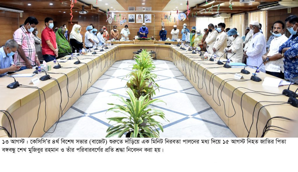সভার শুরুতে ১৫ আগস্টে নিহত জাতির পিতা বঙ্গবন্ধু শেখ মুজিবুর রহমান ও তাঁর পরিবারবর্গের প্রতি শ্রদ্ধা নিবেদনের জন্য এক মিনিট নীরবতা পালন এবং তাঁদের বিদেহী আত্মার মাগফেরাত কামনা করে মোনাজাত করা হয়। এছাড়া করোনায় আক্রান্ত হয়ে মৃত্যুবরণকারী জাতীয় ও স্থানীয় পর্যায়ের ব্যক্তিবর্গসহ কেসিসি’র কর্মকর্তা-কর্মচারীদেরও রূহের মাগফেরাত কামনা করা হয়।