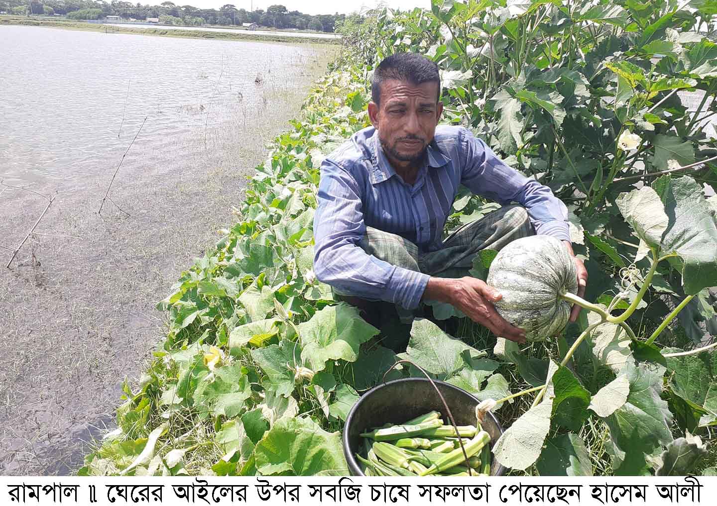 পুজি নিয়ে ৩ বছর ধরে বিভিন্ন প্রকার শাক-সবজি চাষ করে আসছেন। তার দেখাদেখি অন্যরাও উদ্ভদ্ধ হয়ে আইলের উপর সবজি চাষ শুরু করেছেন। সরোজমিনে উপজেলার গৌরম্ভা ইউনিয়নের চিত্রা-খামঘাটা গ্রামে গিয়ে দেখা যায়, হাসেম আলী তার সবজি বাগান থেকে সবজি তুলছেন। তার কাছে জানতে চাওয়া হয় তিনি কি কি সবজি লাগিয়েছেন। এ সময় তিনি বলেন, আজ (রবিবার) খেত থেকে মিষ্টি কুমড়া, ঢেঁড়স, ঝিঙ্গা, লাউ ও ধুন্ধল তুলছি বিক্রির জন্য। এসব বিক্রয় করে তিনি প্রতি সপ্তাহে আড়াই থেকে তিন হাজার টাকা আয় করেন।