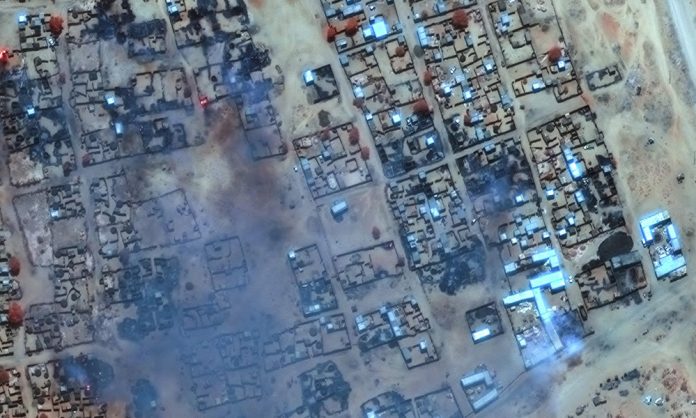 ১৭ এপ্রিলের একটি ছবিতে দেখা যাচ্ছে, সুদানের অবরুদ্ধ দারফুরের এল-ফাশের শহরের কাছে জমজম শিবিরে ধোঁয়া উড়ছে এবং ভবনগুলো পুড়ে গেছে। ছবি : এএফপি