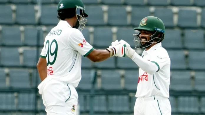 দ্বিতীয় ইনিংসে ব্যাটিংয়ে নেমে শুরুতেই সাদমানের উইকেট হারালেও দ্বিতীয় দিনে আর বিপদে পড়েনি বাংলাদেশ। দিন শেষে এক উইকেটে বাংলাদেশের সংগ্রহ দাঁড়ায় ৫৭। ২৫ রানে পিছিয়ে ছিল তারা।