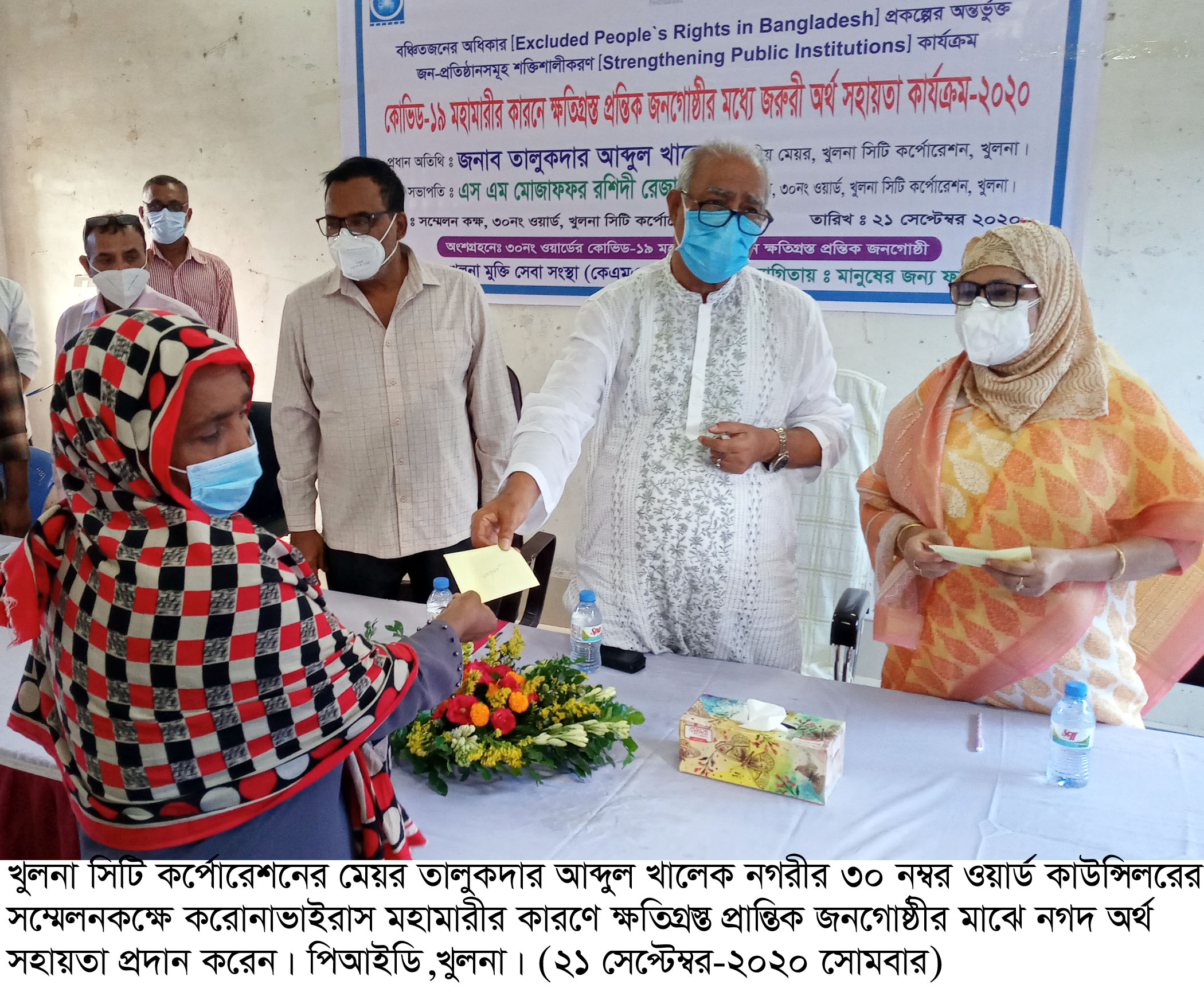 খুলনা সিটি কর্পোরেশনের মেয়র তালুকদার আব্দুল খালেক বলেছেন, সরকার সুবিধাবঞ্চিতদের অর্থসহ বিভিন্ন সহায়তা দিচ্ছে। বাড়িতে বসেই তারা মোবাইলের মাধ্যমে অর্থ তুলতে পারছেন। করোনাভাইরাস সংক্রমণ শুরু থেকে নিম্নআয়ের শ্রমজীবী, অসহায় ও হতদরিদ্রদের মাঝে নগদ অর্থসহ খাদ্যসামগ্রী বিতরণ অব্যাহত রয়েছে। অসচ্ছল, দরিদ্র ও সুবিধাবঞ্চিত নারীদের আত্মকর্মসংস্থানের সুযোগ সৃষ্টি হয়েছে।