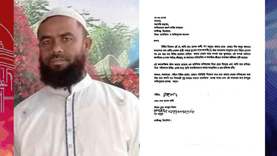 ঝিনাইদহের কালীগঞ্জে নবম শ্রেণির এক ছাত্রীর সঙ্গে বিল্লাল হোসেন নামে এক মাদ্রাসার সহকারী সুপারের প্রেমের সম্পর্কের অভিযোগ উঠেছে। ভুক্তভোগী ওই ছাত্রীর পিতা শিক্ষাপ্রতিষ্ঠানটির সভাপতির কাছে ন্যায়বিচার ও ক্ষতিপূরণ চেয়ে একটি লিখিত অভিযোগ করেছেন। অভিযুক্ত শিক্ষক মো. বিল্লাল হোসেন কালীগঞ্জ উপজেলার কাদিরকোল ওই মাদ্রাসার সহকারী সুপার। তিনি পার্শ্ববর্তী সদর উপজেলার মহারাজপুর ইউনিয়নের কয়ারগাছি গ্রামের আবুল হোসেনের ছেলে। বিল্লাল হোসেন পারিবারিক জীবনে বিবাহিত এবং দুই সন্তানের জনক বলে জানা গেছে। মেয়েটির পিতা অভিযোগপত্রে উল্লেখ করেন, কাদিরকোল আদর্শ দাখিল মাদ্রাসার সহকারী সুপার মো. বিল্লাল হোসেন গত এক বছর ধরে আমার মেয়ের সঙ্গে অনৈতিক সম্পর্ক গড়ে তুলেছেন। এই সম্পর্ক বর্তমানে আপত্তিকর ও চরম পর্যায়ে পৌঁছেছে, যা আমাদের পারিবারিক ও সামাজিক জীবনে মারাত্মক জটিলতা সৃষ্টি করেছে। এ অনাকাঙ্ক্ষিত ঘটনা আমার মেয়েকে এক অনিশ্চিত ভবিষ্যতের দিকে ঠেলে দিয়েছে এবং আমি তার ভবিষ্যৎ নিয়ে উদ্বিগ্ন। একই সঙ্গে আমি সামাজিকভাবে অবহেলিত ও হেয়প্রতিপন্ন হচ্ছি।