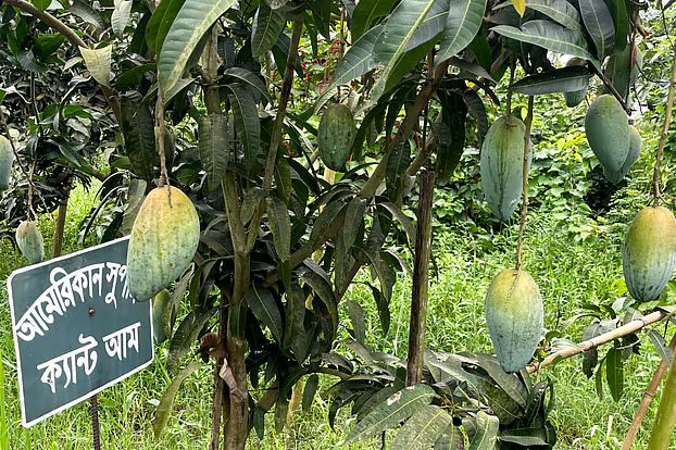 বাগানে ঢুকতেই চোখে পড়ে সারি সারি আমগাছ। প্রতিটি ডালে ঝুলছে বাহারি আম। কোনোটি গাঢ় লাল, যেন পাকা কাশ্মীরি আপেল। কোনোটার ওপরে হালকা লাল, নিচে সবুজ। কোনোটি আবার ম্লান হলুদ, চোখে লাগার মতো মোলায়েম। আবার কোনোটি বেগুনি-সবুজে ছোপ ছোপ, মনে হয় যেন হাতে আঁকা।