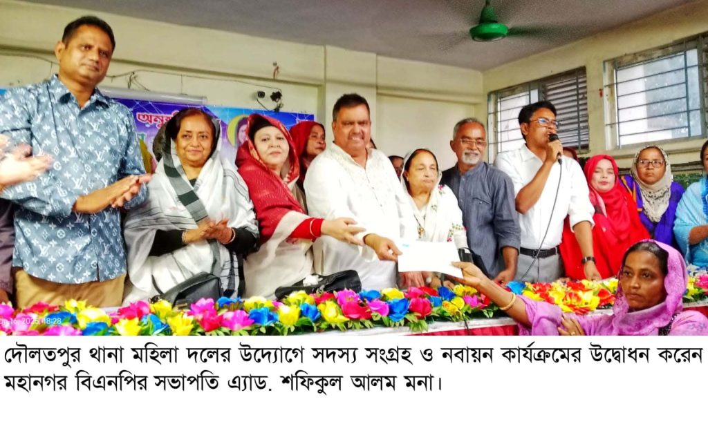 দৌলতপুর থানা মহিলা দল: শনিবার সন্ধ্যায় দৌলতপুর থানা মহিলা দলের উদ্যোগে সদস্য সংগ্রহ ও নবায়ন কর্মসুচির উদ্বোধন অনুষ্ঠান মহিলা দলের সভাপতি সালমা বেগমের সভাপতিত্বে অনুষ্ঠিত হয়। সভায় প্রধান অতিথি ছিলেন, মহানগর বিএনপির সভাপতি এড. শফিকুল অলম মনা, বিশেষ অতিথি ছিলেন মহানগর মহিলা দলের আহবায়ক সৈয়দা নারগিস আলী, রেহানা ঈসা, শেখ সাদী, মুরশিদ কামাল, শেখ ইমাম হোসেন, মতলুবুর রহমান মিতুল, এড. হালিমা খানম, আনজিরা বেগম, শাহনাজ সরোয়ার, নিঘাত সীমা, কওছার জাহান মঞ্জ, শাম্মী চৌধুরী মলি, বীথি বেগম, নাসরিন, ফিরোজা বেগম, সবিনা, হীরা খাতুন, ইসমত জাহান, রাবেয়া বেগম, রিনা পারভীন, সিমি, সোনিয়া, সুখী বেগম, পাপড়ী রায়, আয়শা, রোজী প্রমূখ।