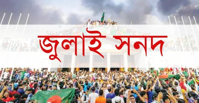সুতরাং উল্লিখিত গণতান্ত্রিক মূল্যবোধ, জনগণের ইচ্ছার প্রতি শ্রদ্ধাবোধ এবং সাংবিধানিক কনভেনশন বজায় রেখে ২০২৪ সালের জুলাই গণ-অভ্যুত্থানে জনগণের ইচ্ছাকে প্রাধান্য দিয়ে আমরা নিম্ন স্বাক্ষরকারীগণ এই মর্মে অঙ্গীকার করছি যে– ১) জনগণের অধিকার ফিরে পাওয়া এবং গণতন্ত্র পুনঃপ্রতিষ্ঠার সুদীর্ঘ আন্দোলন-সংগ্রামের ধারাবাহিকতায় ২০২৪ সালের জুলাই-আগস্টের গণ-অভ্যুত্থানে হাজারো মানুষের জীবন ও রক্তদান এবং অগণিত মানুষের সীমাহীন ক্ষয়ক্ষতি ও ত্যাগ-তিতিক্ষার বিনিময়ে অর্জিত সুযোগ এবং তৎপ্রেক্ষিতে জন-আকাঙ্ক্ষা প্রতিফলন হিসেবে দীর্ঘ ধারাবাহিক প্রক্রিয়ার মধ্যদিয়ে প্রণীত ও ঐকমত্যের ভিত্তিতে গৃহীত নতুন রাজনৈতিক বন্দোবস্তের দলিল হিসেবে ‘জুলাই জাতীয় সনদ ২০২৫’-এর পরিপূর্ণ বাস্তবায়ন নিশ্চিত করব।