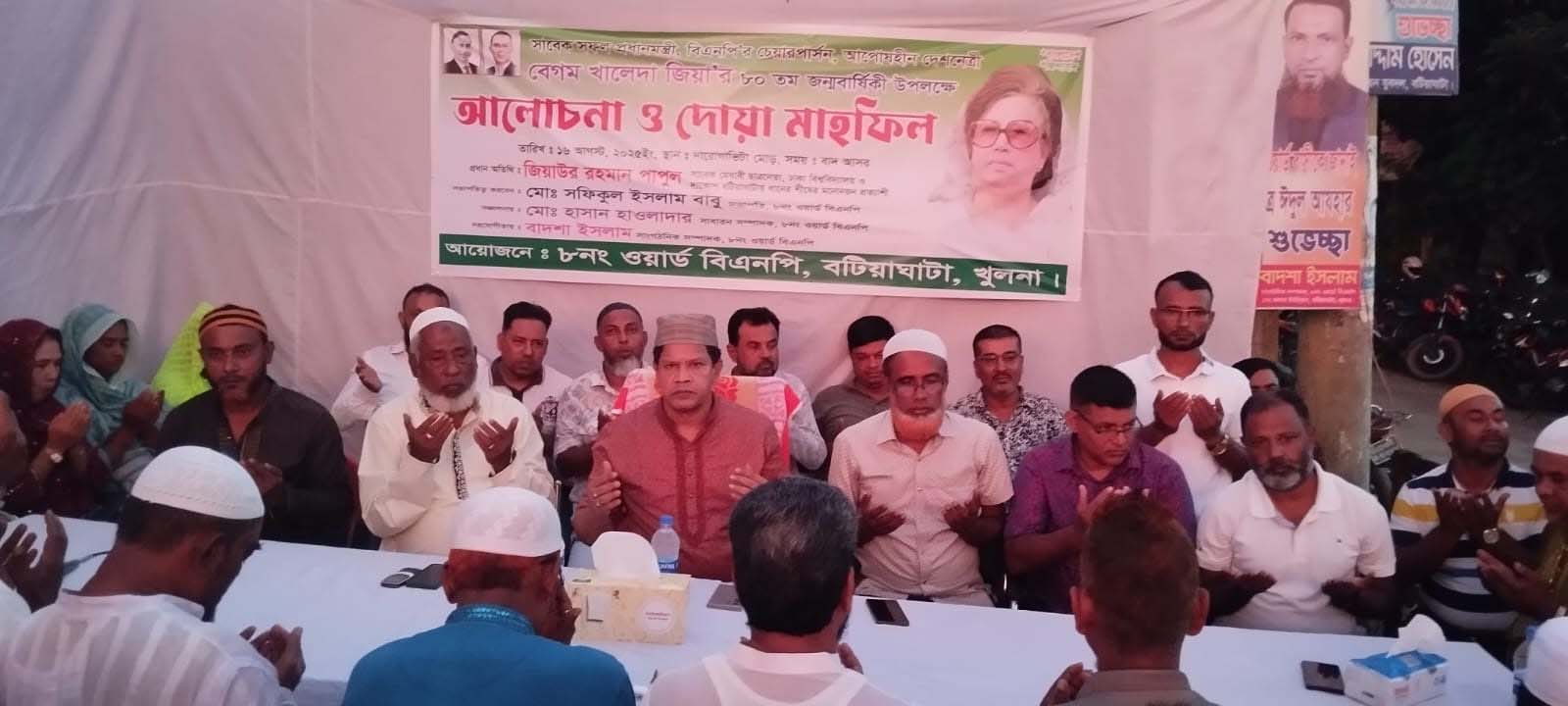 বিএনপির চেয়ারপার্সন বেগম খালেদা জিয়ার জন্মবার্ষিকী উপলক্ষে খুলনার বটিয়াঘাটায় আলোচনা সভা ও দোয়া মাহফিল অনুষ্ঠিত হয়েছে। শনিবার বিকেলে উপজেলার দারোগারভিটা এলাকায় এ সভা অনুষ্ঠিত হয়। উপজেলার ৮ নং ওয়ার্ড বিএনপি এ অনুষ্ঠানের আয়োজন করে।