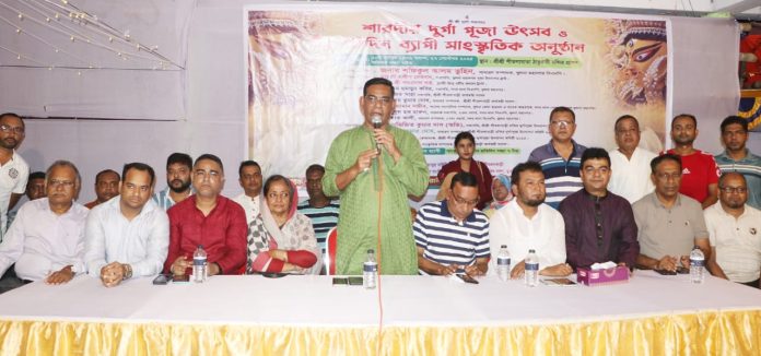 শনিবার (২৭ সেপ্টেম্বর) সন্ধ্যা ৭টায় নগরীর ২৭নং ওয়ার্ডে শ্রীশ্রী শীতলামাতা ঠাকুরানী মন্দিরে শারদীয় দুর্গাপূজা উৎসব ও ৩দিন ব্যাপী সাংস্কৃতিক অনুষ্ঠানের উদ্বোধনকালে প্রধান অতিথির বক্তব্যে তিনি এসব কথা বলেন। তুহিন বলেন, বাংলাদেশে হিন্দু, মুসলিম, বৌদ্ধ, খ্রিস্টান-সব সম্প্রদায়ের মানুষ যুগ যুগ ধরে সম্প্রীতির বন্ধনে আবদ্ধ। বিএনপি সবসময়ই সম্প্রীতি রক্ষা ও ধর্মীয় স্বাধীনতার পক্ষে কাজ করেছে এবং ভবিষ্যতেও করবে। রাজনৈতিক বিভেদ যাই থাকুক, সামাজিক সম্প্রীতি নষ্ট করা যাবে না। বাংলাদেশের মানুষ চিরকালই সাম্প্রদায়িক সম্প্রীতির মধ্য দিয়ে বসবাস করেছে। হিন্দু, মুসলিম, বৌদ্ধ, খ্রিস্টান সকলের মিলনেই গড়ে উঠেছে এই দেশের সংস্কৃতি ও ঐতিহ্য। বিএনপি সবসময় ধর্মীয় স্বাধীনতা ও সাম্প্রদায়িক সম্প্রীতি রক্ষায় বিশ্বাসী এবং প্রতিশ্রুতিবদ্ধ। বিএনপি নেতা শফিকুল আলম তুহিন আরো বলেন, বিগত ১৭ বছর আওয়ামী লীগ হিন্দু সম্প্রদায়ের বন্ধু সেজে তাদের ক্ষতি করেছে। সারাদেশে হিন্দু সম্প্রদায়ের বাড়িঘর ও ব্যবসা প্রতিষ্ঠানে লুটপাট চালিয়ে আওয়ামী লীগ একক কর্তৃত্ব কায়েম করেছে। পতিত হাসিনা সরকার সনাতন ধর্মালম্বীদের নিজেদের স্বার্থে ব্যবহার করেছে। কিন্তু বিএনপি কখনো কাউকে ব্যবহার করেনি, বরং সব ধর্ম-বর্ণের মানুষের নিরাপত্তা ও অধিকার নিশ্চিত করেছে এবং আগামীতেও করবে।