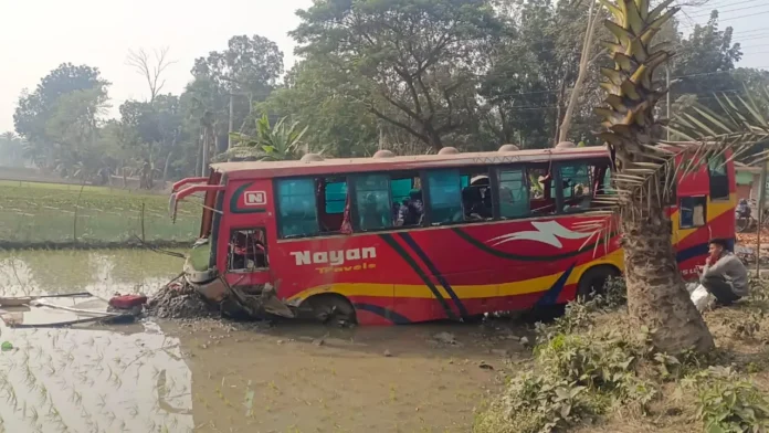 স্থানীয় সূত্র ও আহতরা জানান, যশোর মনিহার-খুলনা রুটের যাত্রীবাহী ‘গড়াই’ পরিবহনের একটি বাস মহেশপুর উপজেলার বাথানগাছি গ্রামে বিয়ে শেষে বরযাত্রী নিয়ে যশোরের নওয়াপাড়ার দিকে যাচ্ছিল। পথে টেঙ্গুরপুর মোড়ে পৌঁছালে সামনে থাকা স্পিডব্রেকারটি চালক খেয়াল না করায় বাসটি নিয়ন্ত্রণ হারিয়ে সড়কের পাশের খাদে পড়ে যায়।