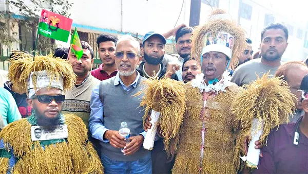মাথা থেকে পা পর্যন্ত শরীর জুড়ে লাগানো পাকা ধান। দূর থেকে দেখলে মনে হয়, বিএনপি’র নির্বাচনী প্রতীক ‘ধানের শীষ’ যেন জীবন্ত হয়ে রাজপথে নেমে এসেছে। ভিন্নধর্মী এই সাজে বিএনপি’র জনসমাবেশে হাজির হয়ে সবার নজর কেড়েছেন কৃষক দলের দুই কর্মী। ব্যতিক্রমী এই উপস্থিতি মুহূর্তেই সমাবেশস্থলে আসা নেতাকর্মী ও সাধারণ মানুষের মনোযোগের কেন্দ্রে পরিণত হয়। রোববার নগরের সিআরবি সাত রাস্তার মোড়ে কথা হয় তাদের সঙ্গে। এই দুই কর্মী হলেন, চট্টগ্রামের মীরসরাই উপজেলার ওয়াহেদপুর ইউনিয়ন থেকে আসা নেপাল চন্দ্র দাশ ও সাইদুল ইসলাম।