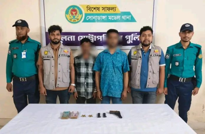 খুলনা নগরীতে যৌথ অভিযানে একটি বিদেশি পিস্তল, গুলি ও ম্যাগাজিনসহ দুইজনকে গ্রেফতার করেছে পুলিশ। শনিবার (৭ মার্চ) সন্ধ্যা ৬টা ৫৫ মিনিটের দিকে খুলনা মেডিকেল কলেজ হাসপাতালের বিপরীত পাশে সোনাডাঙ্গা থানাধীন মাদ্রাসা রোড এলাকার একটি ফ্ল্যাটে এ অভিযান চালানো হয়।