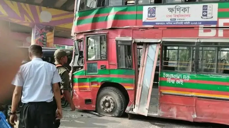 রাজধানীর তেজগাঁও শিল্পাঞ্চল থানা এলাকার বাংলাদেশ চলচ্চিত্র উন্নয়ন করপোরেশন (বিএফডিসি) সংলগ্ন এলিভেটেড এক্সপ্রেসওয়েতে ঢাকা বিশ্ববিদ্যালয়ের শিক্ষার্থীদের বহনকারী বিআরটিসির দ্বিতল একটি বাস দুর্ঘটনার কবলে পড়েছে।
