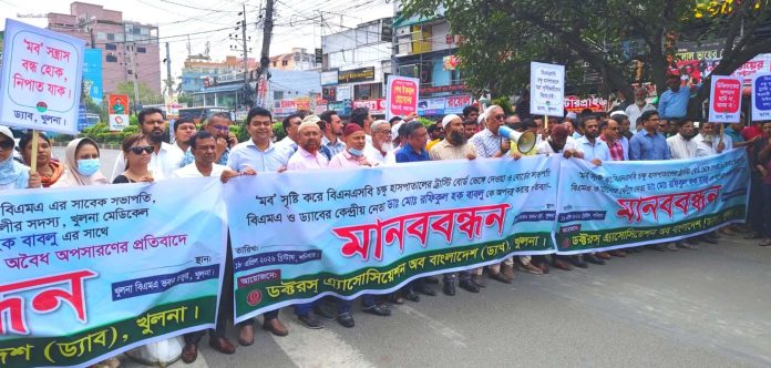 মব সৃষ্টি করে খুলনা বিএনএসবি চক্ষু হাসপাতালের ট্রাস্টি বোর্ড ভেঙ্গে দেওয়া ও বোর্ডের সভাপতি বিএমএ ও ড্যাবের কেন্দ্রীয় নেতা ডা. মো. রফিকুল হক বাবলুকে অপসারণের প্রতিবাদে মানববন্ধন কর্মসূচি পালন করেছে ডক্টরস অ্যাসোসিয়েশন অব বাংলাদেশ (ড্যাব) খুলনা শাখা|