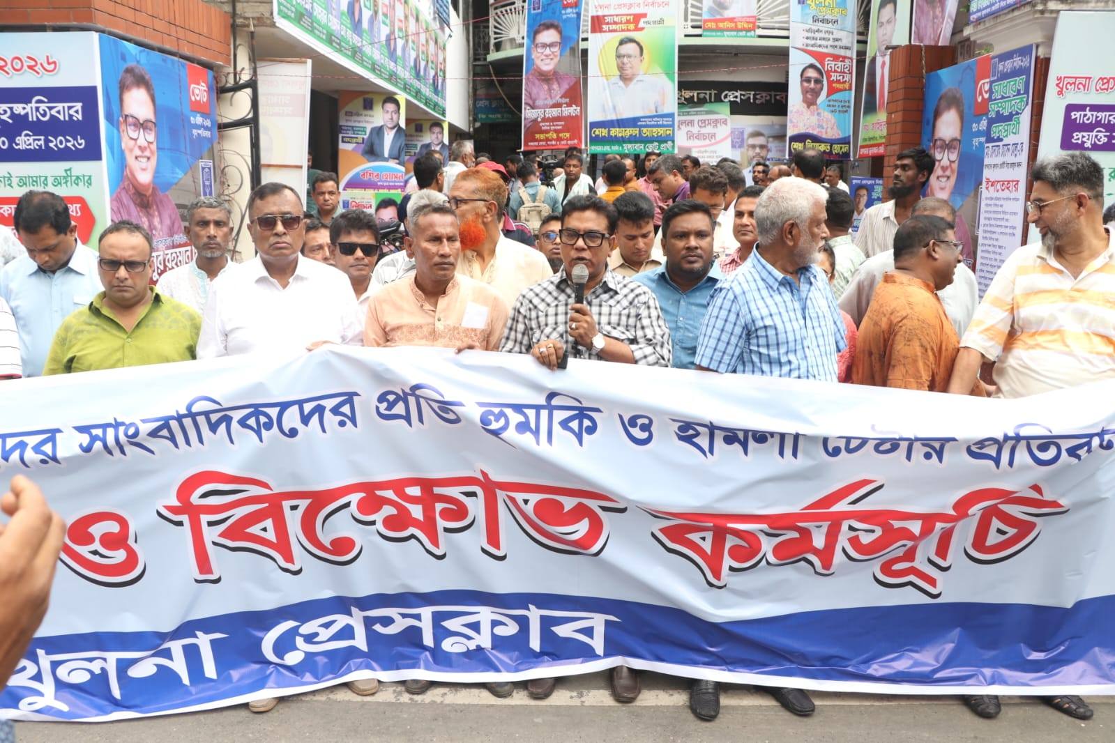রবিবার (২৬ এপ্রিল) সন্ধ্যায় একদল দুর্বৃত্ত হঠাৎ প্রেসক্লাবে ঢুকে পড়ে। প্রেসক্লাবের সভাপতি প্রার্থী ও খুলনা সংবাদপত্র পরিষদের সভাপতি মোস্তফা সরোয়ারকে হুমকি এবং সাধারণ সম্পাদক প্রার্থী ও স্থানীয় সময়ের খবর পত্রিকার সম্পাদক তরিকুল ইসলামকে হুমকি দেয়।