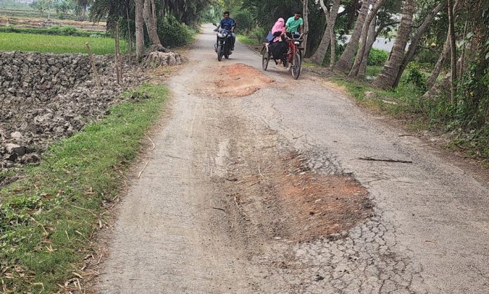 বিটুমিন উঠে গেছে। অনেক জায়গায় সৃষ্টি হয়েছে গর্ত। অনেক জায়গায় দেবে গেছে, পিচ সরে দেখা দিয়েছে উঁচু-নিচু অবস্থা। অথচ সড়কটি মাত্র দুই বছর আগে পুনর্নির্মাণ করা হয়েছে ১০ কোটি টাকারও বেশি ব্যয়ে।