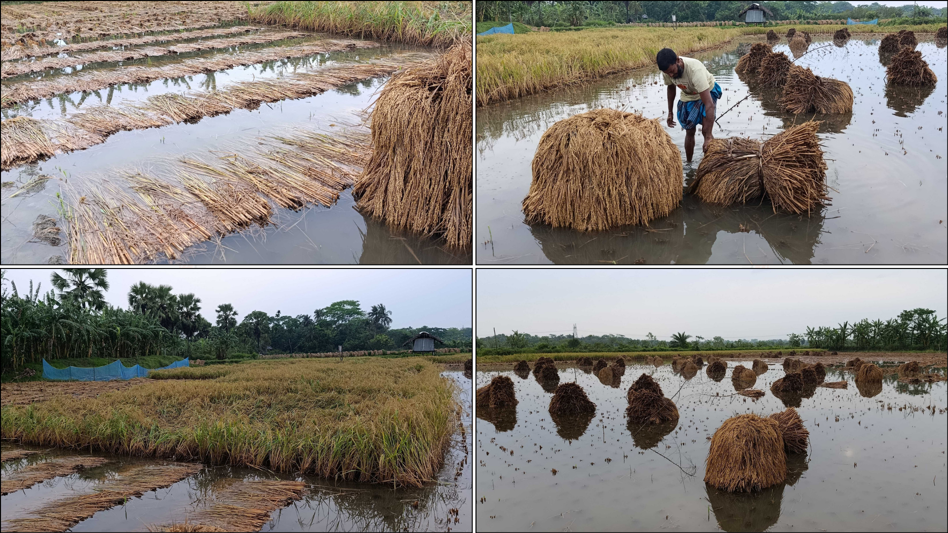 বৃষ্টির পূর্বাভাস পেয়ে অনেকে আগেভাগে ধান কাটা শুরু করলেও অধিকাংশ কৃষক শেষ করতে পারেননি। ফলে একদিকে মাঠে ধান নষ্ট হওয়ার আশঙ্কা, অন্যদিকে কাটা ধান শুকাতে না পারায় বাড়ছে দুর্ভোগ।