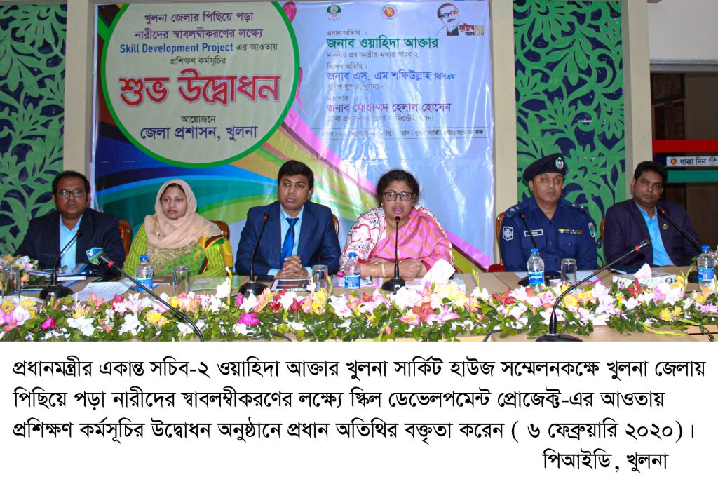 প্রধানমন্ত্রীর একান্ত সচিব-২ ওয়াহিদা আক্তার খুলনা জেলার পিছিয়ে পড়া নারীদের স্বাবলম্বীকরণের লক্ষ্যে দক্ষতা উন্নয়ন প্রকল্পের আওতায় প্রশিক্ষণ কর্মসূচির উদ্বোধন অনুষ্ঠানে প্রধান অতিথির বক্তৃতায় এসকল কথা বলেন। খুলনা জেলা প্রশাসক মোহাম্মদ হেলাল হোসেনের সভাপতিত্বে সার্কিট হাউজ সম্মেলনকক্ষে বৃহস্পতিবার দুপুরে জেলা প্রশাসন এ অনুষ্ঠানের আয়োজন করে। পুলিশ সুপার এস এম শফিউল্লাহ এতে বিশেষ অতিথি ছিলেন।