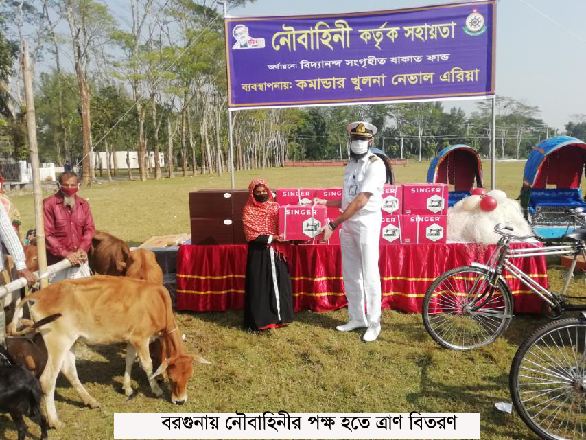বুধবার দেশব্যাপী করোনা পরিস্থিতি, নদীভাঙ্গন ও প্রাকৃতিক দূর্যোগের প্রভাবে ক্ষতিগ্রস্ত বরগুনা জেলার অসহায় ও ছিন্নমূল মানুষের মাঝে জীবিকা নির্বাহ উপকরণ দিয়েছে বাংলাদেশ নৌবাহিনী। কমান্ডার খুলনা নেভাল এরিয়ার তত্ত্বাবধানে অসহায় ও কর্মহীন পরিবারের সাহায্যার্থে বরগুনা জেলার সদর, আমতলী, তালতলি, বামনা, বেতাগী ও পাথরঘাটা উপজেলার ৬০টি দুস্থ পরিবারের মাঝে জীবিকা নির্বাহের জন্য সেলাই মেশিন, রিক্সা, জাল, ভ্যান, গরু ও ছাগল বিতরণ করা হয়।