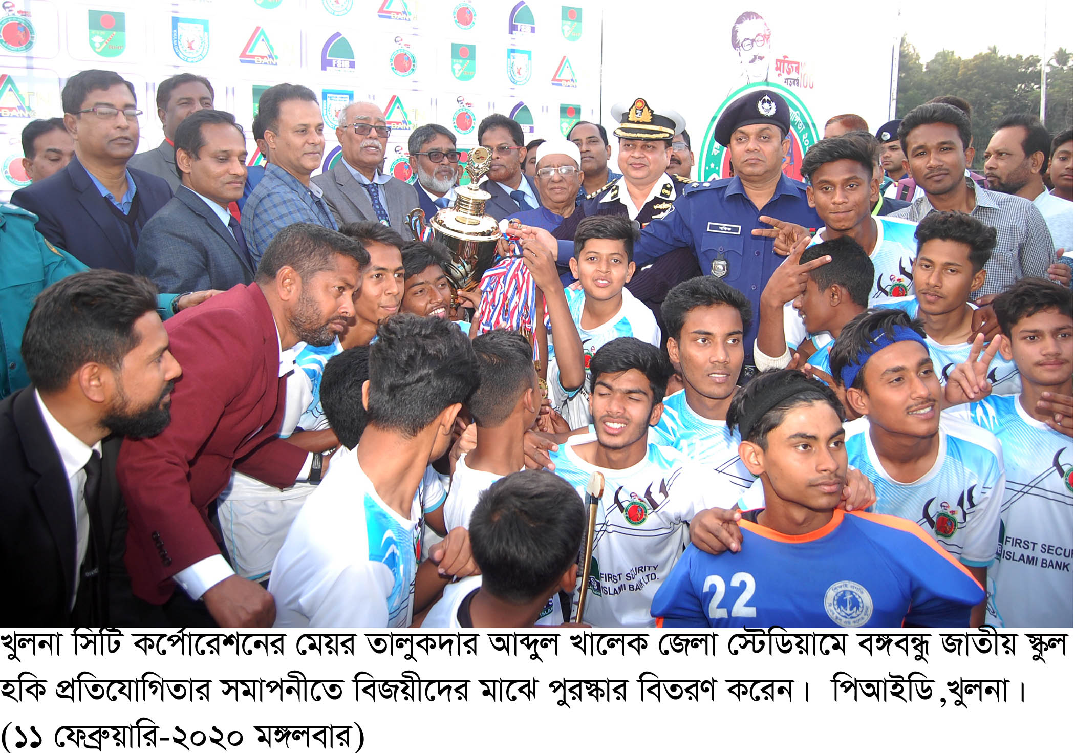 বাংলাদেশ হকি ফেডারেশনের ব্যবস্থাপনায় ও খুলনা জেলা ক্রীড়া সংস্থার সহযোগিতায় আয়োজিত বঙ্গবন্ধু জাতীয় স্কুল হকি প্রতিযোগিতার সমাপনী ও পুরস্কার বিতরণ গতকাল বিকেলে খুলনা জেলা স্টেডিয়ামে অনুষ্ঠিত হয়। খুলনা সিটি কর্পোরেশনের মেয়র তালুকদার আব্দুল খালেক অনুষ্ঠানে প্রধান অতিথি থেকে বিজয়ীদের মাঝে পুরস্কার বিতরণ করেন। প্রধান অতিথি সিটি মেয়র বলেন, অন্যান্য খেলার পাশাপাশি হকি খেলাকে সামনে এগিয়ে নিতে হবে। খেলাধুলা শিক্ষার্থীদের ভাল প্রতিযোগিতার মনভাব তৈরি করে। শিক্ষার পাশাপাশি খেলাধুলার প্রতি সমান গুরুত্ব দিচ্ছে সরকার। আগামী প্রজন্মের শিক্ষার্থীরা দেশেকে ২০৪১ সালের মধ্যে উন্নয়নশীল রাষ্ট্রে পরিণত করবে। তিনি বলেন, সরকার বঙ্গবন্ধু গোল্ডকাপ এবং বঙ্গমাতা গোল্ডকাপ প্রাথমিক বিদ্যালয় ফুটবল টুর্নামেন্ট চালু করে। জাতির পিতা বঙ্গবন্ধু শেখ মুজিবুর রহমান সম্পর্কে নতুন প্রজন্মকে জানতে হবে। অনুষ্ঠানে বিশেষ অতিথি ছিলেন খুলনা রেঞ্জ ডিআইজি ড. খঃ মহিদ উদ্দিন, অতিরিক্ত বিভাগীয় কমিশনার (সার্বিক) মোঃ হাবিবুল হক খান, উপপুলিশ কমিশনার মোঃ এহসান শাহ, জেলা পরিষদের চেয়ারম্যান শেখ হারুনুর রশীদ, হকি ফেডারেশনের সহসভাপতি মোঃ আব্দুর রশিদ শিকদার এবং ফাস্ট সিকিউরিটি ইসলামী ব্যাংক লি. এর কর্মকর্তা মোঃ আব্দুর রশিদ। স্বাগত জানান পুলিশ সুপার ও বঙ্গবন্ধু জাতীয় স্কুল হকি প্রতিযোগিতা কমিটির চেয়ারম্যান এসএম শফিউল্লাহ। খুলনার অতিরিক্ত জেলা প্রশাসক (এলএ) মোঃ ইকবাল হোসেন এতে সভাপতিত্ব করেন। এসময় জেলা ক্রীড়া সংস্থার সাধারণ সম্পাদক কাজী শামীম আহসান, যুগ্ম সম্পাদক জিএম রেজাউল ইসলাম প্রমুখ উপস্থিত ছিলেন। পরে মেয়র বিজয়ীদের মাঝে পুরস্কার বিতরণ করেন। ক ও খ গ্রুপ মিলে মাধ্যমিক পর্যায়ে খুলনা বিভাগের ১০টি বিদ্যালয় অংশ নেয়। ফাইনাল খেলায় চুয়াডাঙ্গা এম এ বারি উচ্চ বিদ্যালয়কে ২-০ গোলে হারিয়ে খুলনা নৌবাহিনী স্কুল এন্ড কলেজ চ্যাম্পিয়ান অর্জন করে।