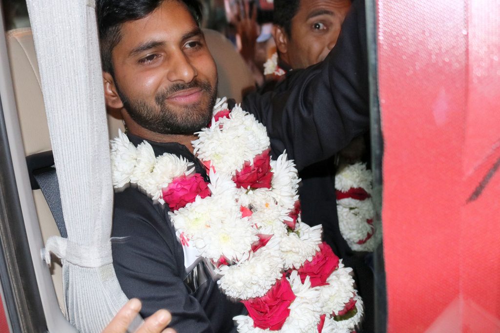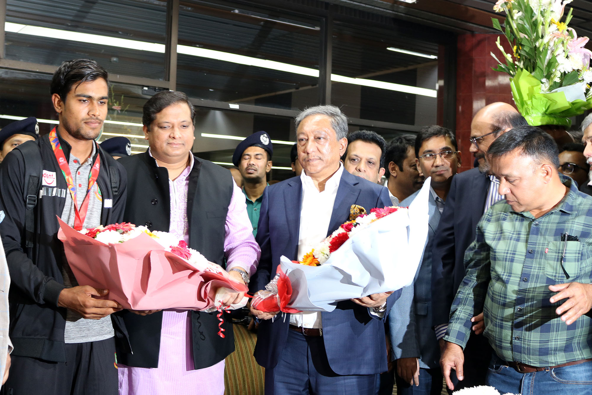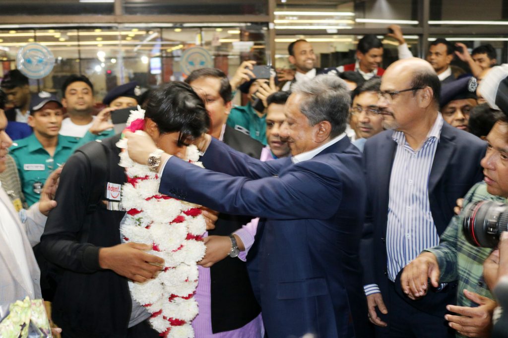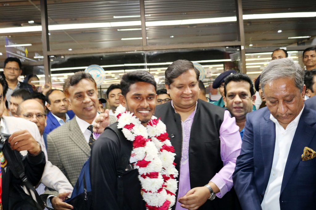 বিমান থেকে নামার পর বিশ্বজয়ী ক্রিকেটারদের একে একে ফুলের মালা পরিয়ে দেন যুব ও ক্রীড়া প্রতিমন্ত্রী মো. জাহিদ আহসান রাসেল।