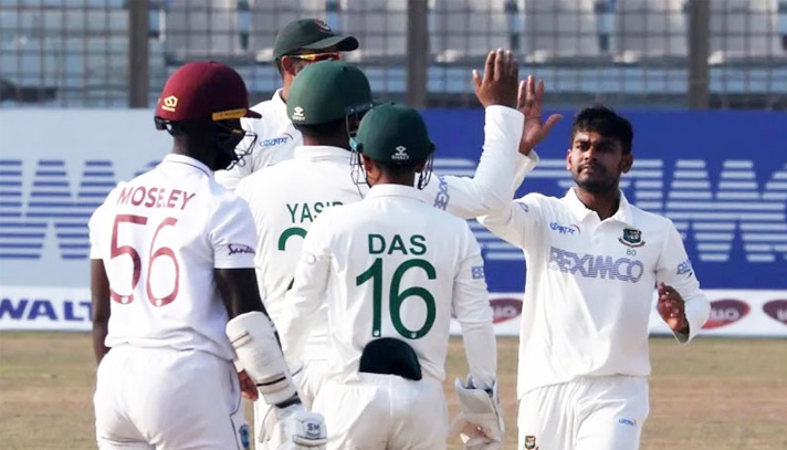 প্রতিরোধ গড়ে তুলেছিলেন লিটন দাস ও মেহেদি হাসান মিরাজ। সপ্তম উইকেট জুটিতে তারা যোগ করেন ১২৬ রান। কিন্তু তাদের জুটি ভাঙার পর নামে ধস, বাংলাদেশ অলআউট হয়ে যায় ২৯৬ রানে। যার ফলে ওয়েস্ট ইন্ডিজ পায় ১১৩ রানের লিড। তবে এ লিড সঙ্গে নিয়ে দ্বিতীয় ইনিংসের শুরুটা ভালো হয়নি ওয়েস্ট ইন্ডিজের। তাদেরকে চাপে রেখেই তৃতীয় দিনের খেলা শেষ করেছে বাংলাদেশ।