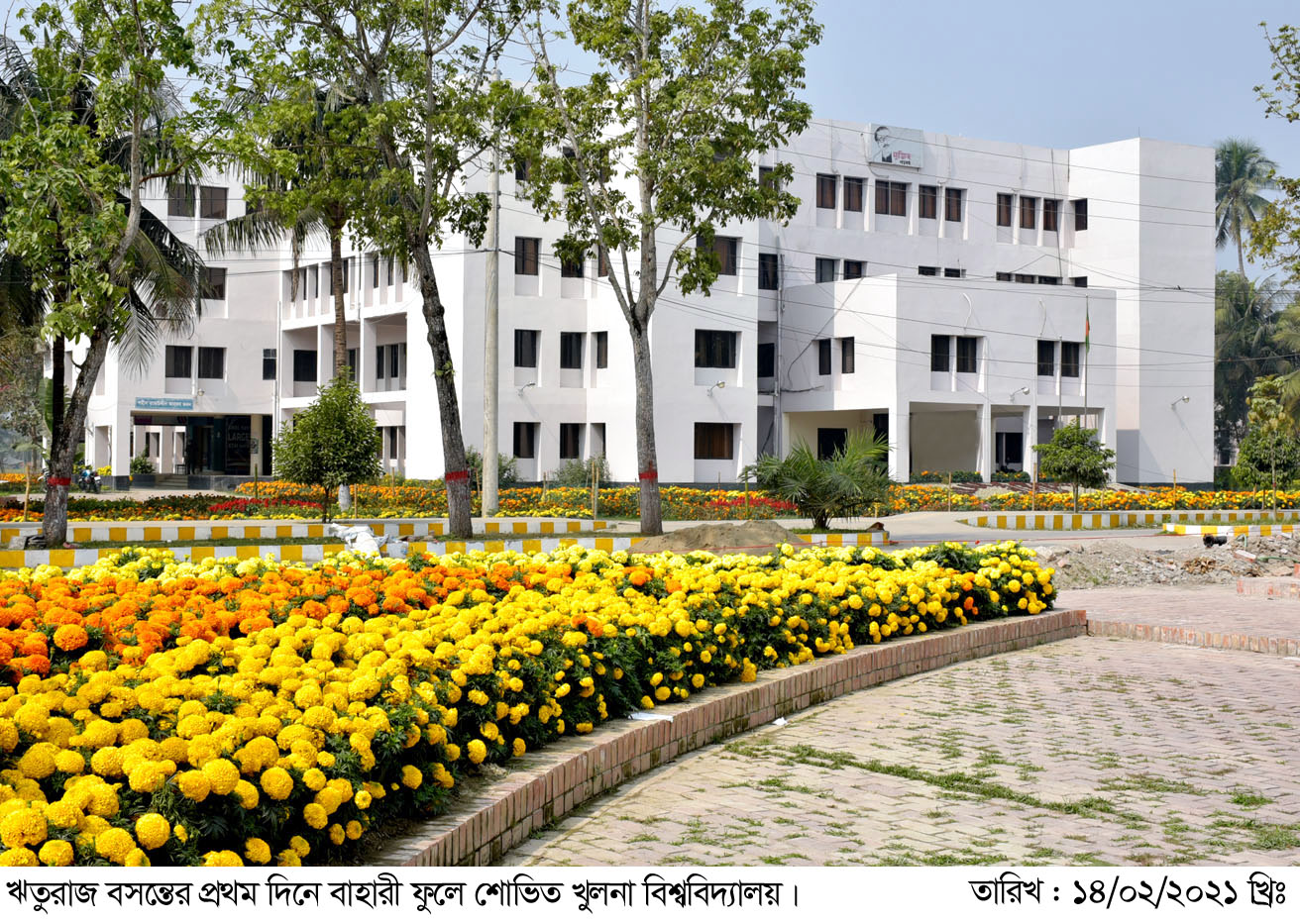 খুলনা বিশ্ববিদ্যালয় ক্যাম্পাসে চোখ পড়লেই এখন দেখা যাবে নানা বর্ণের ফুলের সমারোহ। ফুলের গন্ধে মাতোয়ারা ক্যাম্পাস যা এক ভিন্ন মাত্রা যোগ করেছে। নানা প্রকারের গাঁদা, আকাশি সাদা স্নোবল, সালভিয়া, দোপাটি, ক্যালেন্ডোলা, দায়েনথাঁচ, ফ্লোগর্স, ইন্টালিয়াম, স্নাকড্রাগন, পেনজি, কারিয়াফছি, ভারবিনা, পিটুনিয়া, স্টার গোল্ড, মৌচন্ডা, পানচাটিয়া, অ্যালমন্ডা, গ্লাডিয়া, তালপাম্প, চন্দ্রমল্লিকা, ইনকা, ছোট চায়না গাঁদা, মোরগঝুঁঁটি, কসমস, জুঁই, চামেলি ছাড়াও আছে টগর, বেলি এবং সাইকাস, ক্রিসমাস, জবা, রঙ্গন এমনি কি কয়েকটি গাছে পলাশ ফুলও শোভা পাচ্ছে। পলাশের ডাল ভরে গেছে ফুলে। বিশ্ববিদ্যালয়ের শহিদ তাজউদ্দীন আহমদ ভবনের চারপাশ জুড়েই ফুল আর ফুল। মুজিব শতবর্ষ উপলক্ষে নির্মিত ম্যুরাল ‘কালজয়ী মুজিব’ এর সম্মুখভাবে শোভা পাচ্ছে অসংখ্য ফুল। যেন কার্পেটের মতো বিছানো। এছাড়াও বিশ্ববিদ্যালয়ের মাইকেল মধুসূদন দত্ত অতিথি ভবন, শহিদ সৈয়দ নজরুল ইসলাম প্রশাসন ভবন, অগ্রণী ব্যাংক, পোস্ট অফিস ভবন, ওয়াকওয়ে, একাডেমিক ভবন ও আবাসিক হল, উপাচার্যের বাসভবন প্রাঙ্গণেও ফুটেছে নানা প্রকারের ফুল।