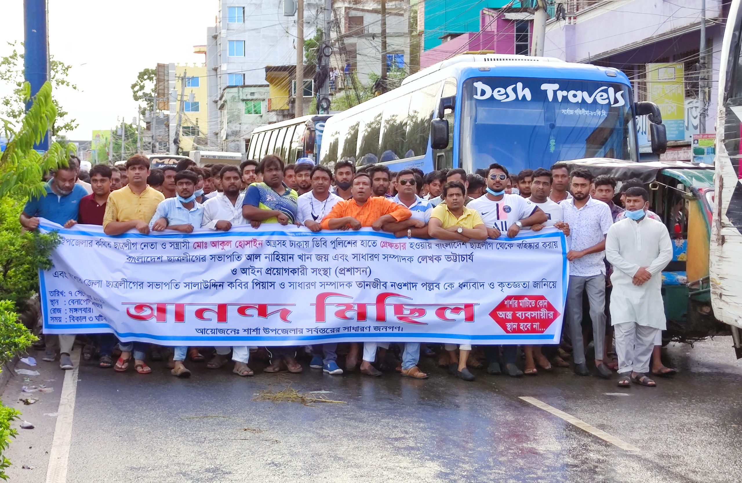 যশোরের শার্শা উপজেলা ছাত্রলীগের সাধারন সম্পাদক আকুল হোসেন ৮টি বিদেশী পিস্তল সহ ডিবি পুলিশের হাতে আটকের পর কেন্দ্রীয় ছাত্রলীগ কর্তৃক তাকে দল থেকে বহিস্কার করায় আজ মংগলবার সন্ধ্যায় শার্শা উপজেলা ছাত্রলীগ সহ বিভিণœ পেশার মানুষ আনন্দ মিছিল ও বিক্ষোভ সমাবেশ করেছে বেনাপোলে।