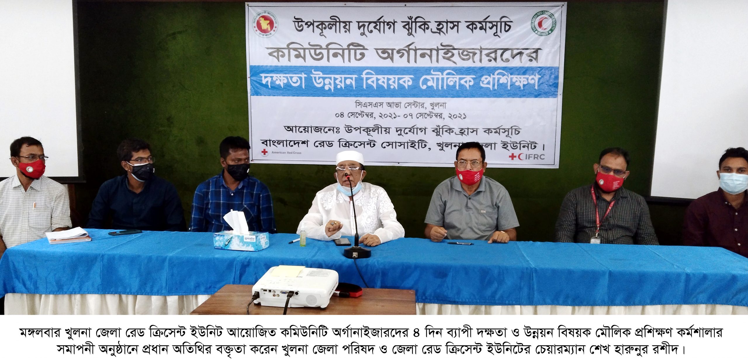 ‘উপকূলীয় দূর্যোগ ঝুঁকি হ্রাস কর্মসূচি’র অধীনে খুলনা জেলা রেড ক্রিসেন্ট ইউনিটের উদ্যোগে কমিউনিটি অর্গানাইজারদের ৪ দিন ব্যাপী দক্ষতা ও উন্নয়ন বিষয়ক মৌলিক প্রশিক্ষণ কর্মশালা মঙ্গলবার বিকালে শেষ হয়েছে।