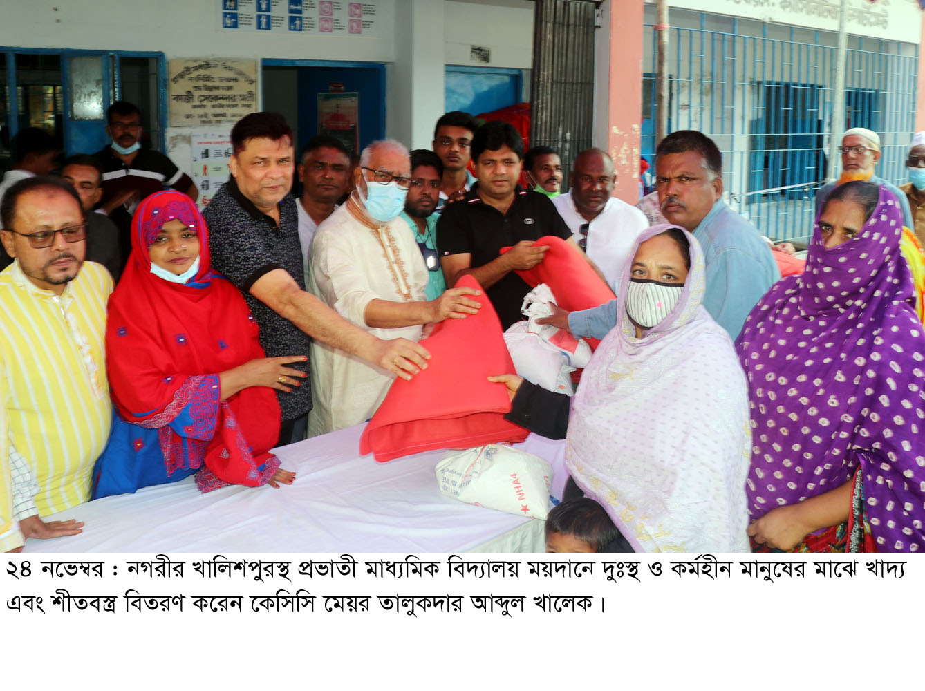 খুলনা সিটি কর্পোরেশনের মেয়র তালুকদার আব্দুল খালেক আজ বুধবার সকালে নগরীর খালিশপুরস্থ প্রভাতী মাধ্যমিক বিদ্যালয় ময়দানে প্রধান অতিথি হিসেবে উপস্থিত থেকে দুঃস্থ ও কর্মহীন মানুষের মাঝে খাদ্য এবং শীতবস্ত্র বিতরণ করেন।