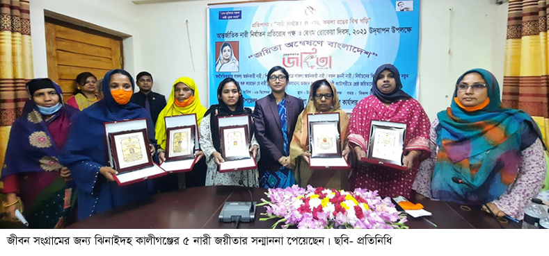 পিছিয়ে পড়া সমাজে অনেকে জীবন সংগ্রামে সফল হয়েছেন। অনেকে দেখেছেন সংসার ব্যক্তি জীবনের নির্যাতনের বিভীষিকা। কিন্ত তারা নিজে কখনও দুমড়ে মুচড়ে যাননি। বরং নিজে ঘুরে দাঁড়িয়ে সংগ্রাম করেছেন। অনেক বন্ধুর পথকে আলিঙ্গনের মাধ্যমে ধৈর্য্যকে পুঁজি করে সামনে এগিয়ে গেছেন। আজ তারা হয়েছেন সফল। তাদেরকে এমন সফলতায় অন্যরাও উৎসাহিত হচ্ছেন। এভাবে ঝিনাইদহের কালীগঞ্জে সমাজ উন্নয়নে অবদান রাখা ও সংগ্রামী জীবনের জন্য এ উপজেলার ৫ নারীকে জয়িতা সম্মাননা প্রদান করা হয়েছে। আন্তর্জাতিক নারী নির্যাতন প্রতিরোধ পক্ষ ও বেগম রোকেয়া দিবস ২০২১ উপলক্ষে বৃহস্পতিবার দুপুরে তাদেরকে উপজেলা সম্মেলন কক্ষে সন্মাননা প্রদান করা হয়। এ সময় আনুষ্ঠানিকতার মাধ্যমে তাদের হাতে সন্মাননা ক্রেষ্ট তুলে দেন কালীগঞ্জ উপজেলা নির্বাহী অফিসার সাদিয়া জেরিন।