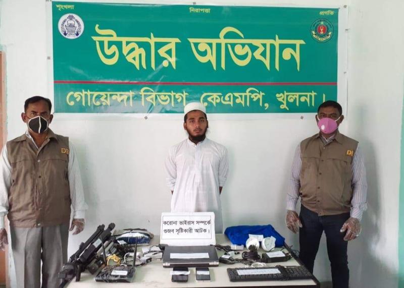 করোনা নিয়ে গুজব সৃষ্টির অভিযোগে গ্রেফতার মো. রুহুল আমিনকরোনা ভাইরাস নিয়ে ইউটিউবে ভিডিও দিয়ে গুজব সৃষ্টি করার অভিযোগে খুলনায় একজনকে গ্রেফতার করা হয়েছে। খুলনা মেট্রোপলিটন পুলিশের (কেএমপি) গোয়েন্দা শাখা (ডিবি) মঙ্গলবার সন্ধ্যায় বাগমারা মেইন রোড এলাকায় অভিযান চালিয়ে তাকে গ্রেফতার করে। এরপর তার নামে খুলনা সদর থানায় ডিজিটাল নিরাপত্তা আইনে মামলা দায়ের করা হয়েছে। গ্রেফতারকৃত মো. রুহুল আমিন ইউটিউব চ্যানেলে সড়ক পরিবহন ও সেতুমন্ত্রী ওবায়দুল কাদের করোনা ভাইরাস আক্রান্ত বলে মিথ্যা তথ্য দিয়ে ভিডিও চিত্র তৈরি করে গুজব সৃষ্টি করে বলে মামলায় অভিযোগ করা হয়। কেএমপির উপ কমিশনার মিডিয়া মুখপাত্র শেখ মনিরুজ্জামান মিঠু এ তথ্য নিশ্চিত করেছেন। তিনি জানান, ‘খুলনা মহানগর ডিবি পুলিশের একটি টিম ৭ এপ্রিল ৫টার দিকে গোপন সংবাদের ভিত্তিতে অভিযান চালায়। খুলনা সদর থানাধীন বাগমারা এলাকার একটি বাড়ি থেকে মো. রুহুল আমিনকে (২২) গ্রেফতার করে। সে বাগেরহাটের শরণখোলা উপজেলার পশ্চিম রাজৈর গ্রামের মো. নজরুল ইসলামের ছেলে। সে বাংলাদেশ আওয়ামী লীগের সাধারণ সম্পাদক এবং সড়ক পরিবহন ও সেতুমন্ত্রী ওবায়দুল কাদের করোনা ভাইরাসে আক্রান্ত হয়েছেন বলে ভিডিও তার নিজের তৈরিকৃত ইউটিউব চ্যানেলে আপলোড করে। যা সম্পূর্ণ বিভ্রান্তিকর ও উসকানিমূলক। বর্তমানে মহামারিরূপ ধারণ করা করোনা ভাইরাস সম্পর্কে গুজব সৃষ্টি করার অপরাধে তার বিরুদ্ধে খুলনা সদর থানায় ডিজিটাল নিরাপত্তা আইনে মামলা দায়ের করা হয়েছে।’