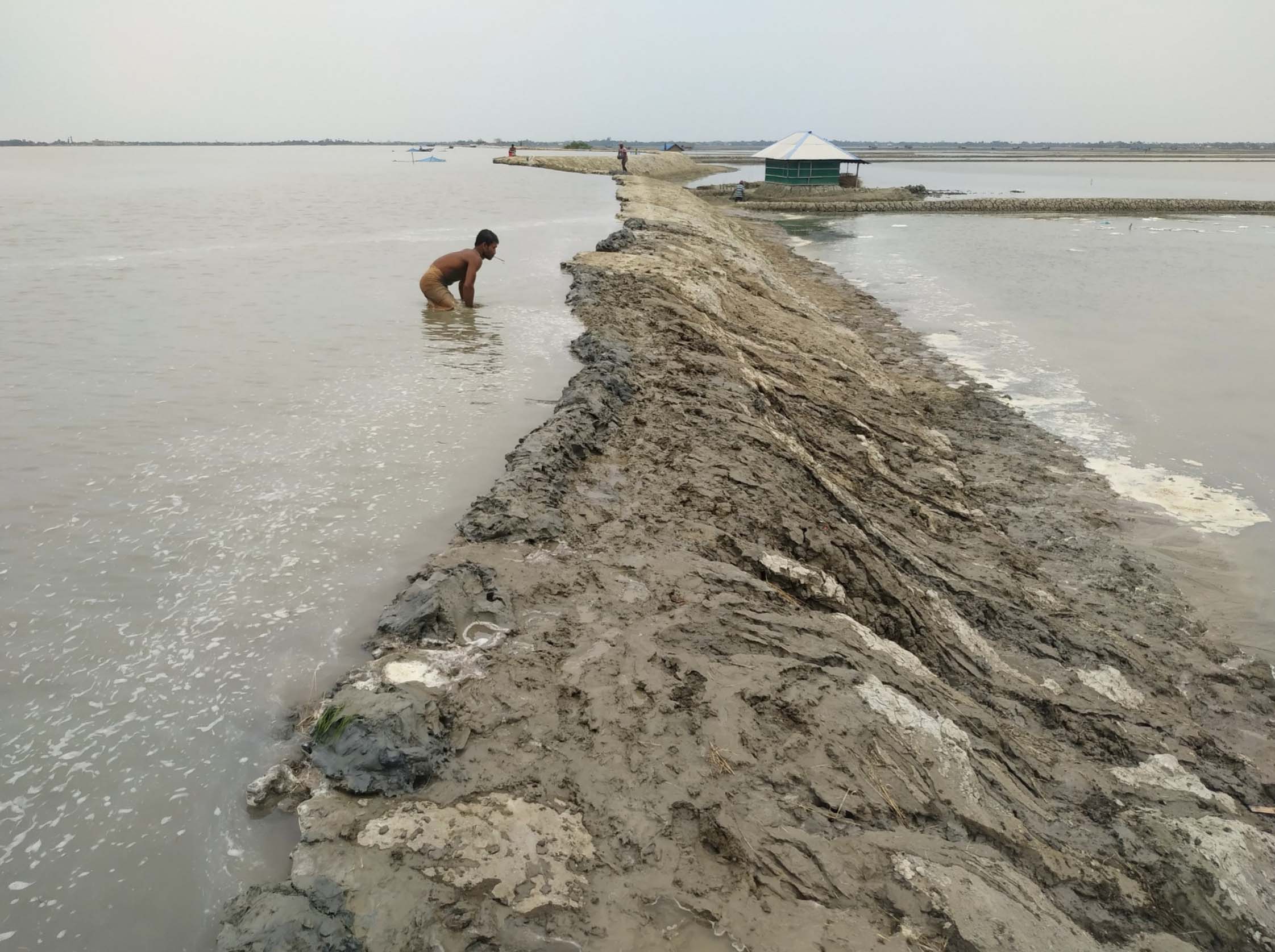 নদীতে পূর্ণিমার জোয়রের পানি বেড়ে যাওয়ায় কয়রায় দশালিয়া ওয়াপদার বেঁড়িবাাঁধ ছাপিয়ে ভিতরে পানি প্রবেশ করায় করোনার মত আরও একটি আতঙ্ক ছড়িয়েছে এলাকার মানুষের মধ্যে। জানা গেছে, বুধবার সকাল ১১ টার পর কপোতাক্ষ নদীতে জোয়ারের পানি বৃদ্ধি পাওয়ায় দূর্বল বেঁড়িবাঁধ ছাপিয়ে লোকালয়ে পানি প্রবেশ শুরু করলে মহারাজপুর ইউপি চেয়ারম্যান আব্দুল্লাহ আল মামুন লাভলু করোনা পরিস্থিতি উপেক্ষা করে স্থানীয় লোকজনদের দিয়ে কোন রকমে লবন পানি আটকাতে সক্ষম হয়েছে। সরেজমিনে উক্ত বেঁড়িবাঁধের প্রায় ৫০০ ফুট রাস্তার উপর দিয়ে ভিতরে পানি প্রবেশ করতে দেখা যায়। এবং খবর পেয়ে আশেপশের গ্রামের লোকজন ছুটে এসে মাটি দিয়ে পানি আটকাতে চেষ্টা করে। এসময় চেয়ারম্যান লাভলু জানান, দিনের বেলায় কোন রকমে রক্ষা করা গেছে, কিন্তু রাতে পূর্ণিমার বড় জোয়ারে পানি বৃদ্ধি পেলে রক্ষা করা কঠিন হয়ে পড়বে। সেজন্য তিনি পানি উন্নয়ন বোর্ডের কর্মকর্তাসহ সংসদ সদস্য কে বিষয়টি অবগত করেছেন বলে জানান। এদিকে বেঁড়িবাঁধের বেহাল অবস্থার খবর এলাকায় ছড়িয়ে পড়লে মানুষের মধ্যে প্রাণঘাতি করোনার মত নতুন করে আরও একটি আতঙ্ক ছড়িয়ে পড়েছে। সংসদ সদস্য আলহাজ্ব আকতারুজ্জামান বাবু সাংবাদিকদের জানান, বিষয়টি জানার পর তিনি পানি উন্নয়ন বোর্ডের বিভিন্ন দপ্তরে যোগাযোগ করেছেন এবং ঘটনাস্থল দেখভালের জন্য লোকজন প্রস্তুত রাখতে নির্দেশ দিয়েছেন।এছাড়া স্থানীয় চেয়ারম্যান ও মেম্বরদের সার্বক্ষণ বাঁধের দিকে লক্ষ্য রাখতে এবং জনগণকে আতঙ্কিত না হওয়ার জন্য অনুরোধ জানিয়েছেন।পাউবোর আমাদী সেকশন অফিসার সেলিম মিয়া জানান, দশহালিয়া বেড়িবাধ উপচে পানি পানি প্রবেশ করার বিষয়টি জানতে পেরেছি। পাউবোর উর্ধতন কর্তৃপক্ষকে জানানো হয়েছে। জরুরী ভিত্তিতে ব্যবস্থা গ্রহন করা হবে