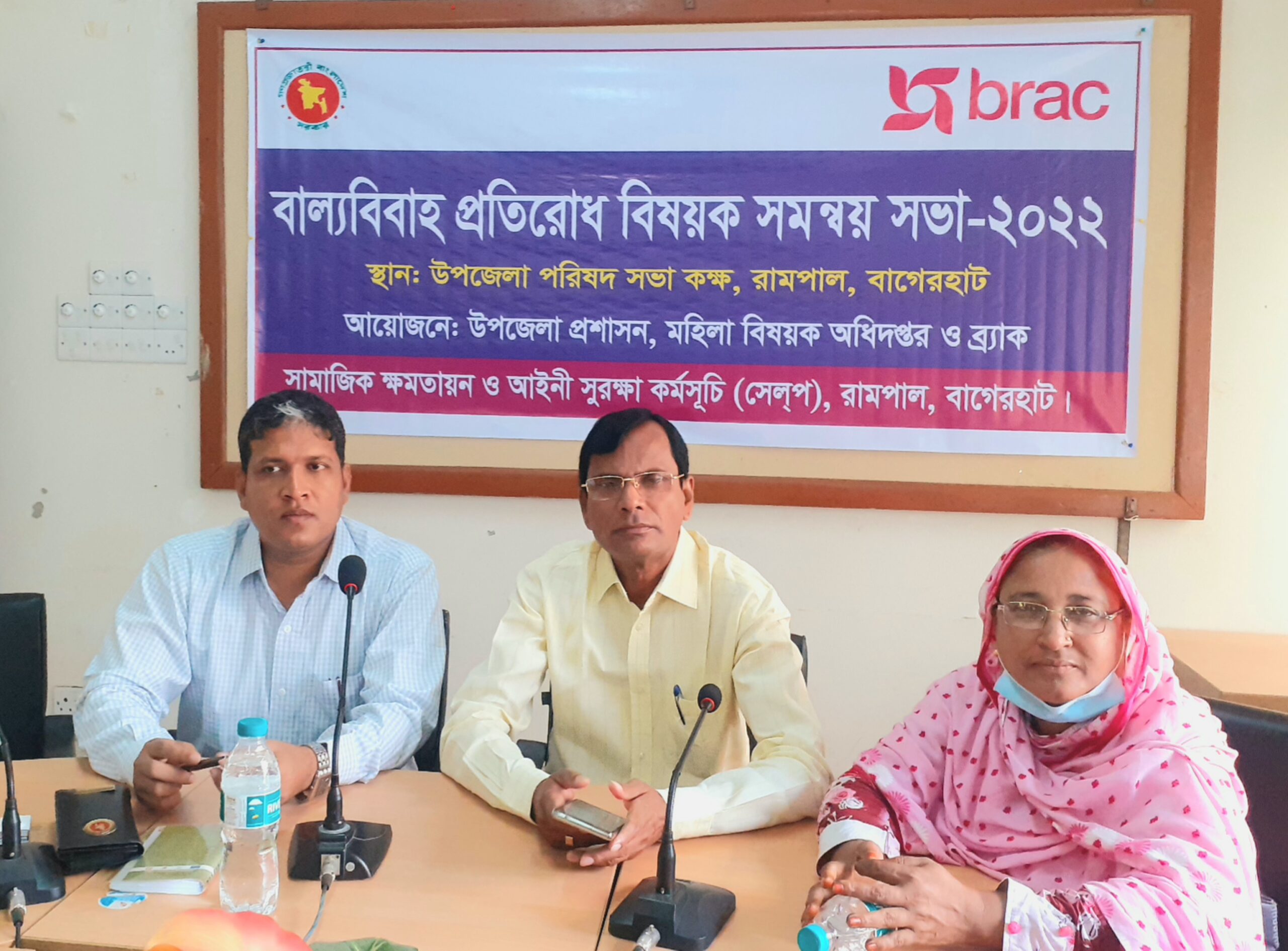 রামপালে বাল্যবিবাহ প্রতিরোধ বিষয়ক এক সমন্বয় সভা অনুষ্ঠিত হয়েছে। রামপাল উপজেলা প্রশাসন, মহিলা বিষয়ক দপ্তর ও ব্রাকের আয়োজনে এ সভা অনুষ্ঠিত হয়। বেলা ১১ টায় রামপাল উপজেলা নির্বাহী কর্মকর্তা মো. কবীর হোসেন এর সভাপতিত্বে উপজেলা সম্মেলন কক্ষে অনুষ্ঠিত সভায় বক্তব্য দেন, উপজেলা চেয়ারম্যান সেখ মোয়াজ্জেম হোসেন। আরও বক্তব্য দেন যুব উন্নয়ন কর্মকর্তা নাসির উদ্দীন, মহিলা বিষয়ক কর্মকর্তা, প্রেসক্লাব রামপালের সভাপতি এম, এ সবুর রানা, রামপাল থানা পুলিশের প্রতিনিধি এসআই শ্রীবাস কুন্ডু, ব্রাক সংস্থার ম্যানেজার মো. ইসমাইল হোসেন, ব্রাকের এ্যাসোসিয়েট কর্মকর্তা জেসমিন আক্তার, মেম্বার মোফাজ্জল হোসেন, রাবেয়া বেগম প্রমুখ। সভায় বাল্যবিবাহ প্রতিরোধে সামাজিক যোগাযোগ বৃদ্ধি ও সচেতনতামূলক কার্যক্রম জোরদার করার উপর জোর দেন বক্তাগণ।