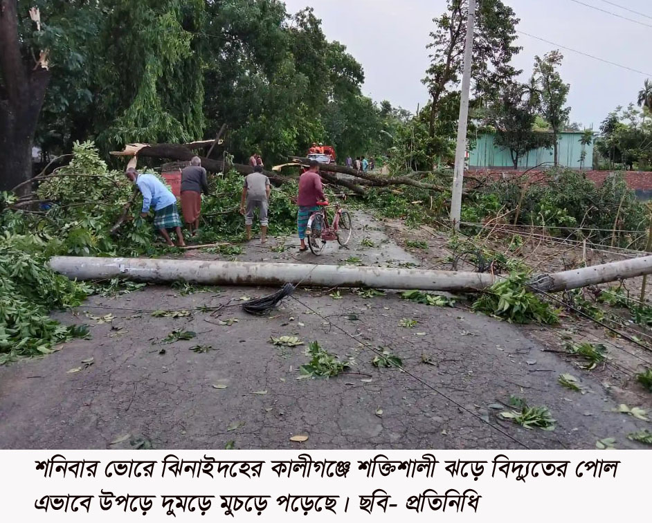 সময় শনিবার ভোর সাড়ে ৫ টা। হঠাৎ পূব আকাশে ঘন কালো মেঘ। মূহুর্তে¡র মধ্যেই চারপাশে নেমে এলো কালো ঘন অন্ধ্যকার। দৃশ্যটা ছিল রাতের মতই। এরপর শুরু হলো জোরালো ঝড়ের সঙ্গে বৃষ্টিও। ঝড় বৃষ্টি বেশি সময়ের স্থায়ী না হলেও তা আনুমানিক ১৮ থেকে ২০ মিনিটের মত হবে। তবে অল্প সময়ের প্রবল গতির এ ঝড়ে অতীতের যে কোন সময়ের চেয়ে ক্ষয়ক্ষতি বেশি বৈ কম নয়। যার তান্ডবে ঝিনাইদহের কালীগঞ্জসহ জেলার প্রায় সব অঞ্চলেই চলেছে এক ধবংসলীলা। আচমকা এ ঝড়ে কাঁচা ঘরবাড়ি,গাছপালা ও উঠতি ফসলের ক্ষতি ব্যাপক। অপরদিকে মধুমাস জ্যৈষ্টের নানা রকমের ফল আম, জাম,কাঁঠাল, লিচু ঝরে পড়েছে। আর নাবি বোরোর ক্ষেতগুলোর ধান পুনরায় ঝড়োবৃষ্টির কবলে পড়ে কফিনে শেষ পেরেক ঠুকার অবস্থা। এমনটাই ছিল ঝিনাইদহের কালীগঞ্জসহ অধিকাংশ অঞ্চলের ঝড়ের তান্ডবলীলা।