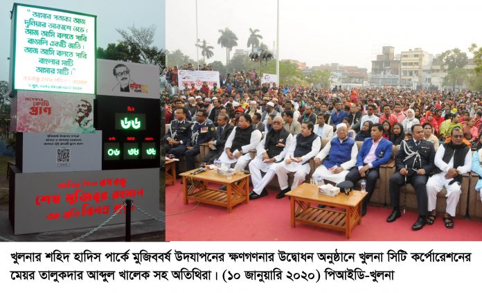 ৬৬ দিন পরেই শুরু হতে যাচ্ছে মুজিববর্ষ। সর্বকালের সর্বশ্রেষ্ঠ বাঙালি, জাতির পিতা বঙ্গবন্ধু শেখ মুজিবুর রহমানের জন্মশতবার্ষিকীতে আগামী ১৭ মার্চ ২০২০ হতে ১৭ মার্চ ২০২১ সময়কালকে বাঙালি জাতি মুজিববর্ষ হিসেবে উদযাপন করবে। বঙ্গবন্ধুর স্বদেশ প্রত্যাবর্তন দিবসে মুজিববর্ষ উদযাপনের ক্ষণগণনা শুরু হলো। প্রধানমন্ত্রী শেখ হাসিনা জাতীয় প্যারেড গ্রাউন্ডে এই ক্ষণগণনার শুভ উদ্বোধন করেন। ক্ষণগণনার এই শুভ উদ্বোধন অনুষ্ঠানটি আজ (শুক্রবার) বিকেলে খুলনার শহিদ হাদিস পার্কেও আনন্দঘন পরিবেশে উদযাপিত হয়। এসময় খুলনা সিটি কর্পোরেশনের মেয়র তালুকদার আব্দুল খালেক, খুলনা-২ আসনের সংসদ সদস্য সেখ সালাহউদ্দিন জুয়েল, খুলনা-৬ আসনের সংসদ সদস্য মোঃ আক্তারুজ্জামান বাবু, বিভাগীয় কমিশনার ড. মুঃ আনোয়ার হোসেন হাওলাদার, খুলনা বিশ্বাবদ্যালয়ের ভাইস চ্যান্সেলর প্রফেসর ড.মুহাম্মদ ফায়েক উজ্জামান, জেলা পরিষদের চেয়ারম্যান শেখ হারুনুর রশীদ, মেট্রোপলিটন পুলিশ কমিশনার খন্দকার লুৎফুল কবির, খুলনা রেঞ্জ ডিআইজি ড. খঃ মহিদ উদ্দিন, জেলা প্রশাসক মোহাম্মদ হেলাল হোসেন, বীর মুক্তিযোদ্ধা, সরকারি কর্মকর্তা, রাজনীতিবিদ, সামাজিক সাংস্কৃতি সংগঠনের নেতৃত্ববৃন্দ, সুশীল সমাজের প্রতিনিধি, বিভিন্ন শিক্ষা প্রতিষ্ঠানের শিক্ষক-শিক্ষার্থী, গণমাধ্যমকর্মী ও সর্বস্তরের মানুষ বিপুল উৎসাহ নিয়ে উপস্থিত ছিলেন।